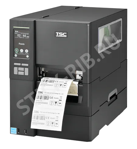 Термотрансферный принтер штрих-кода TSC MH641. Прямая термопечать и термотрансферная печать, разрешение 600 dpi, ширина печати до 104 мм, скорость печати 152 мм/сек. Интерфейс USB 2.0, USB-Host, RS-232, Ethernet.